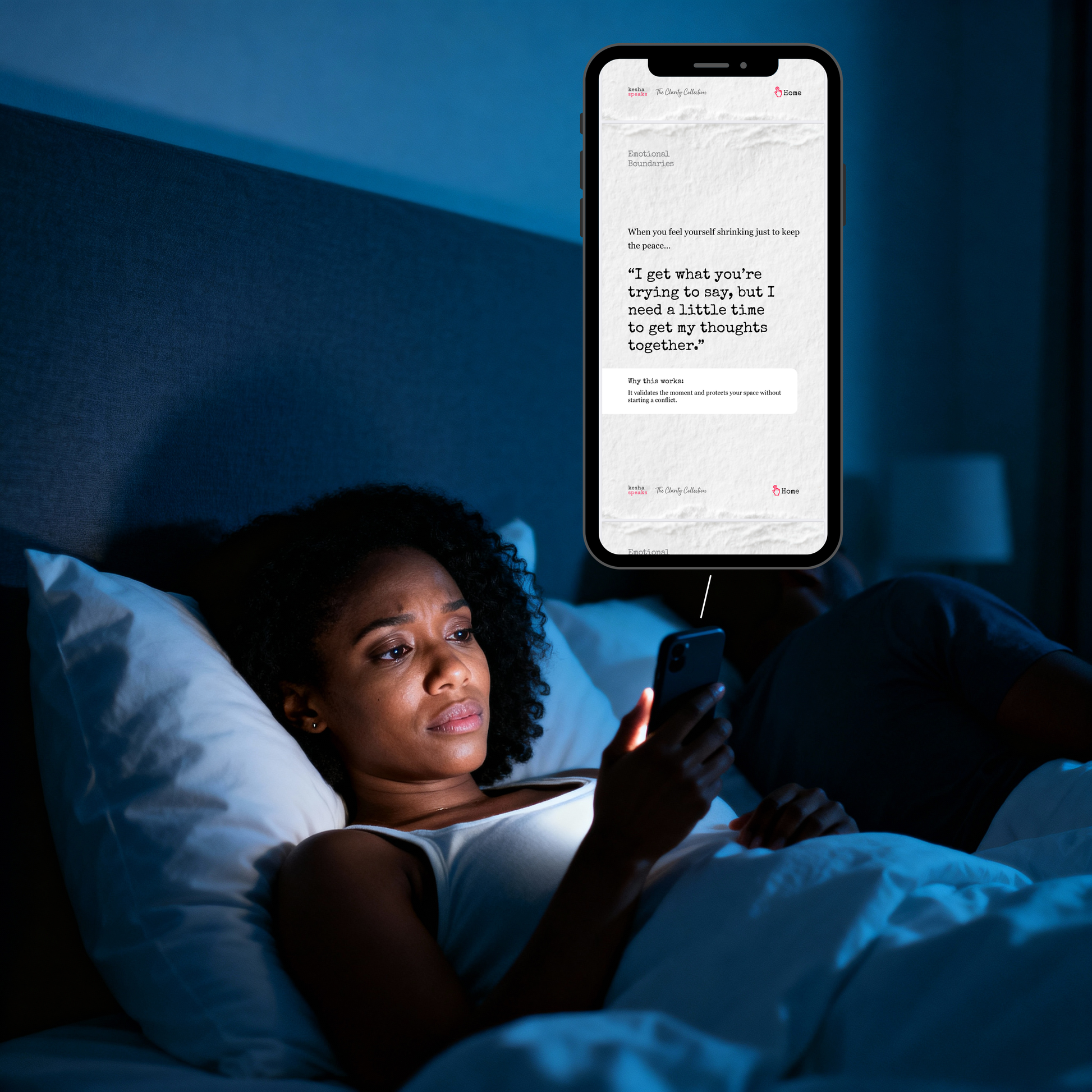 The Boundary Scripts deck is a mobile-friendly, swipeable set of 24 real-life phrases designed to help you communicate clearly, calmly, and without guilt — even with people who struggle emotionally, get defensive easily, or twist your words.